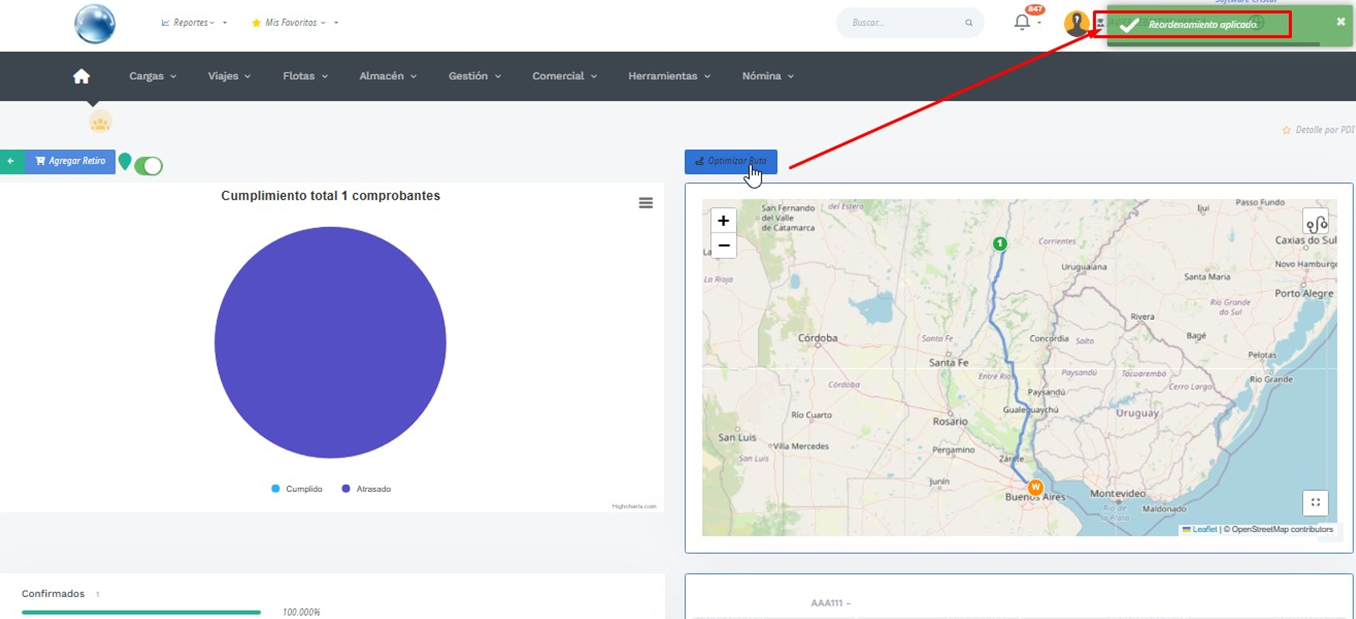 Tenemos disponible un botón que nos permitirá optimizar la ruta que debe seguir el chofer a la hora de realizar el todos los envíos que tiene asignados.
