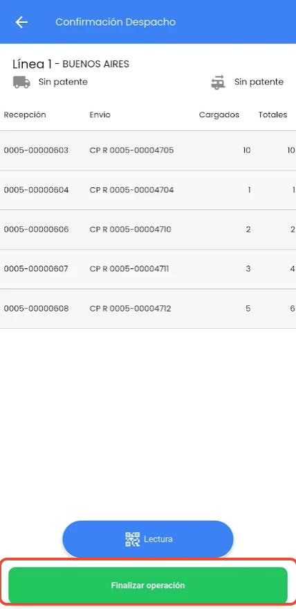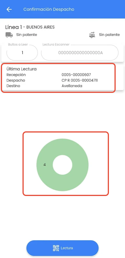 - Se confirma con el lector cada despacho en el camión, bulto a bulto o en lotes de bultos.