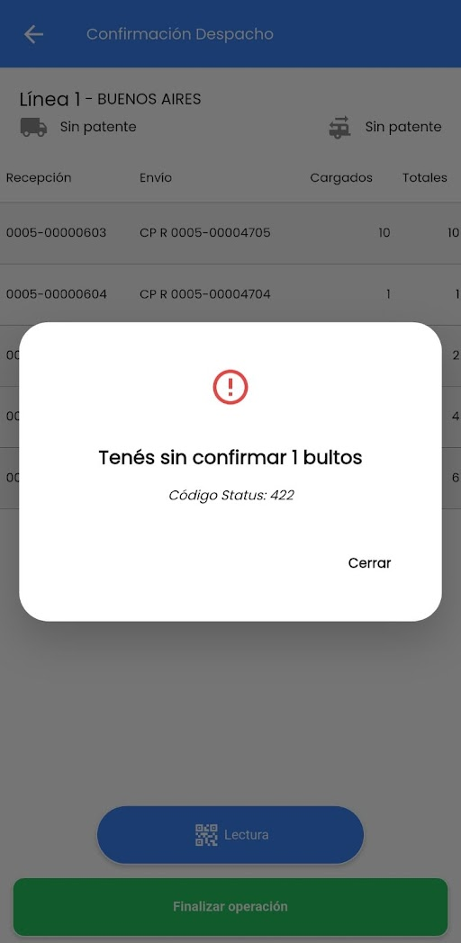 - Más bultos facturados que confirmados, en este caso se despliega un mensaje "Tenes sin confirmar XX bultos".