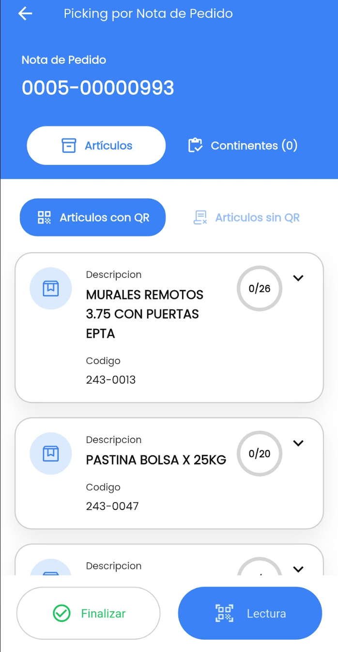 Cuando un pickeador selecciona una NDP, podrá empezar a cargar los articulos asociados a dicho comprobante