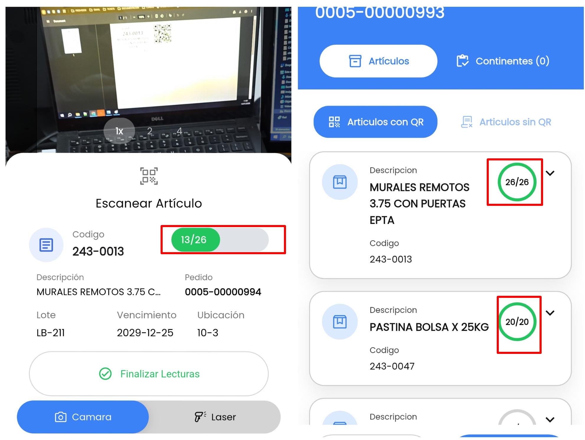 Podrá chequear el progreso de la nota de pedido, ya que se contabiliza lo que se fue pickeando y lo que tiene pendiente de hacerlo. Esto es tanto en el transcurso de las lecturas como en la grilla de información general